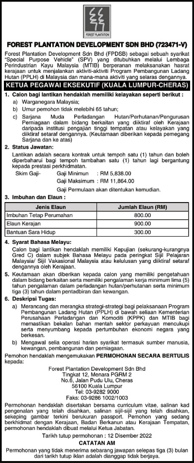 Iklan Jawatan Forest Plantation Development Sdn Bhd