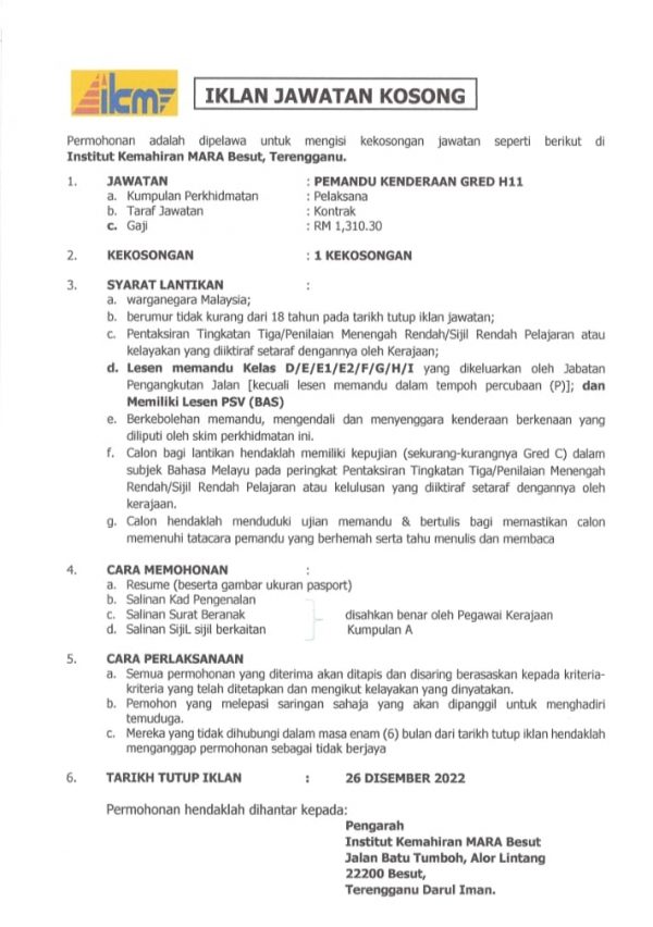 Iklan Jawatan Institut Kemahiran MARA (IKM)