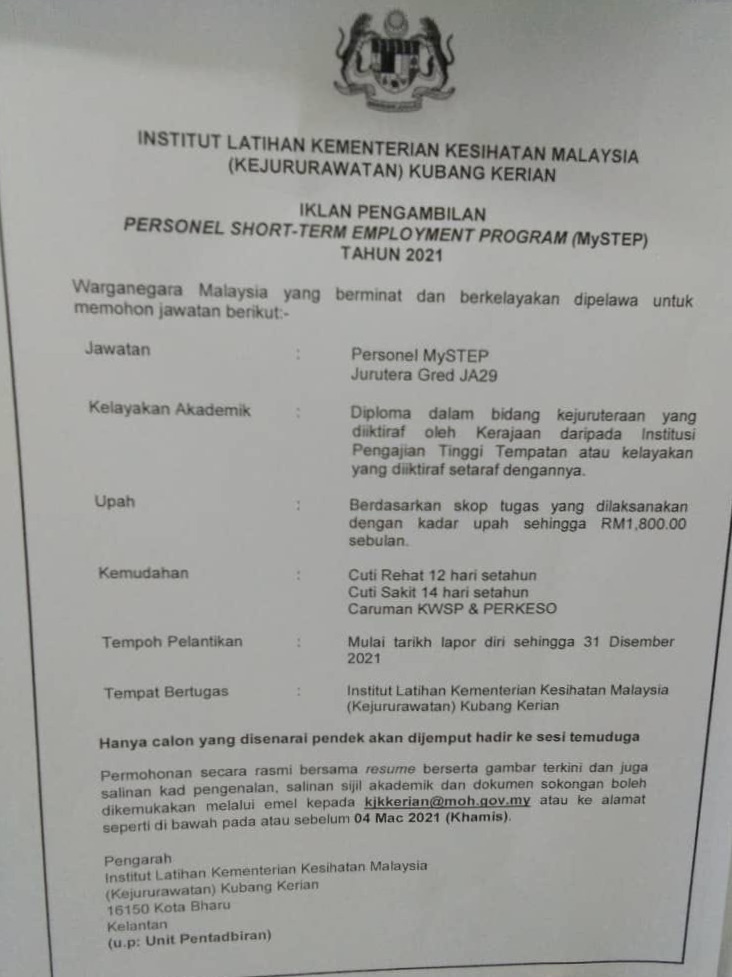Iklan Jawatan Institut Latihan Kementerian Kesihatan Malaysia (Kejururawatan) Kubang Kerian
