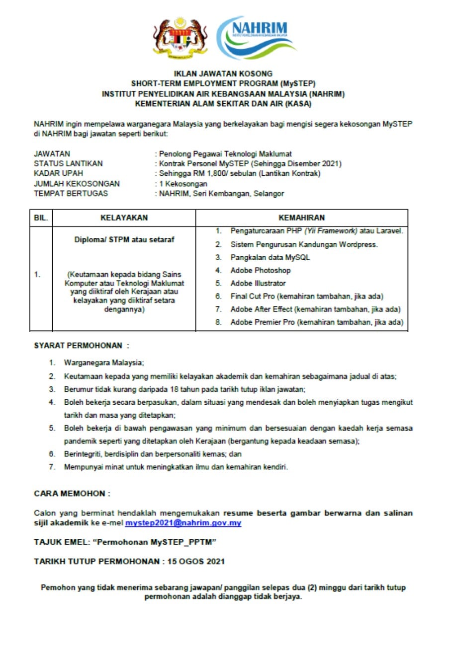 Iklan Jawatan Institut Penyelidikan Air Kebangsaan Malaysia (NAHRIM)