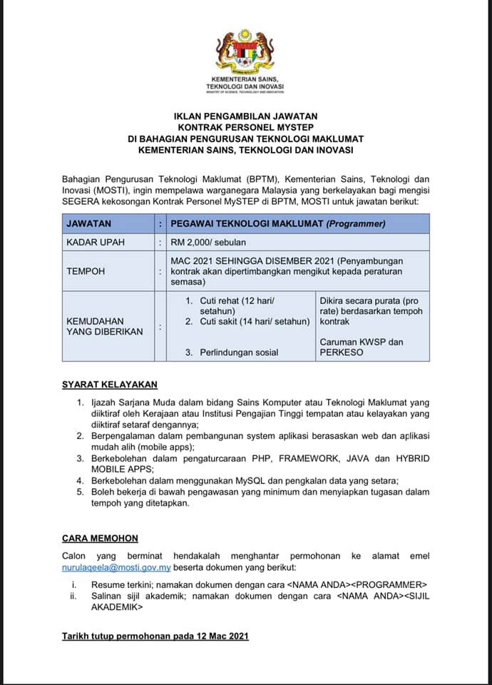 Iklan Jawatan Kementerian Sains, Teknologi dan Inovasi (MOSTI)