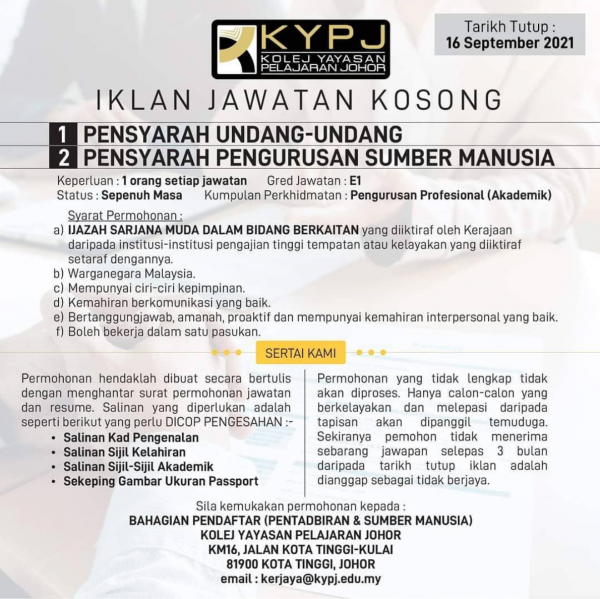 Iklan Jawatan Kolej Yayasan Pelajaran Johor