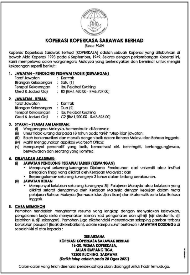 Iklan Jawatan Koperasi Koperkasa Sarawak Berhad