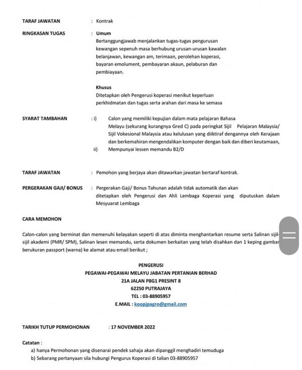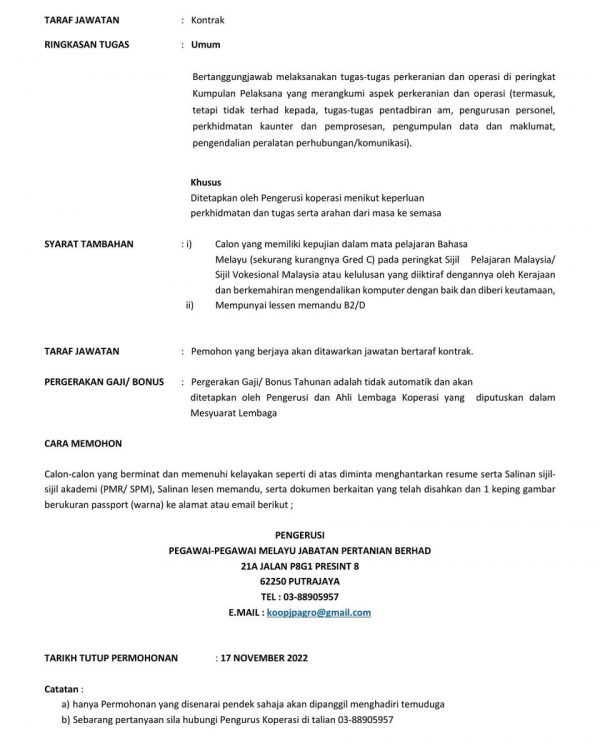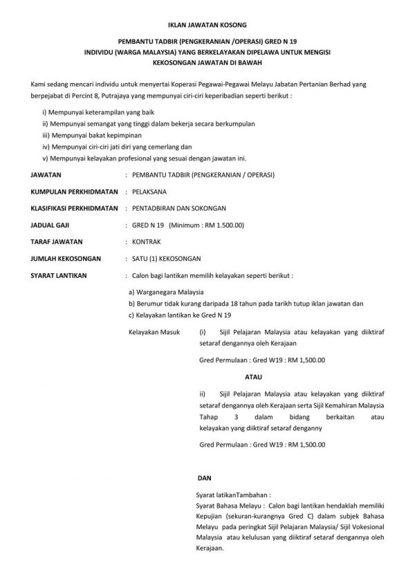 Iklan Jawatan Koperasi Pegawai-Pegawai Melayu Jabatan Pertanian Berhad