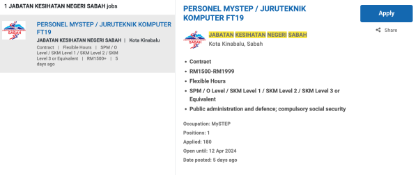 Permohonan jawatan ini boleh dibuat melalui Portal MyFutureJobs. Sila ke Portal MyFutureJobs dan Masukkan Kata Carian yang ingin dicari “Jabatan Kesihatan Negeri Sabah” di bahagian carian untuk memohon jawatan yang diiklankan.