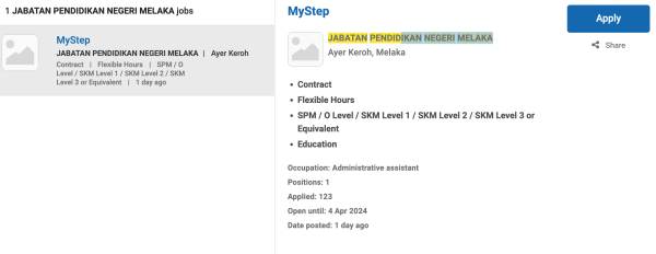 Permohonan jawatan ini boleh dibuat melalui Portal MyFutureJobs. Sila ke Portal MyFutureJobs dan Masukkan Kata Carian yang ingin dicari “Jabatan pendidikan Negeri Melaka” di bahagian carian untuk memohon jawatan yang diiklankan.