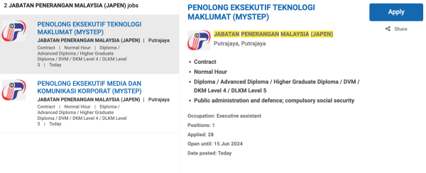 Permohonan jawatan ini boleh dibuat melalui Portal MyFutureJobs. Sila ke Portal MyFutureJobs dan Masukkan Kata Carian yang ingin dicari “Jabatan Penerangan Malaysia” di bahagian carian untuk memohon jawatan yang diiklankan.