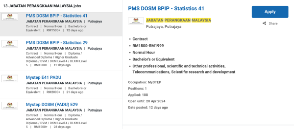 Permohonan jawatan ini boleh dibuat melalui Portal MyFutureJobs. Sila ke Portal MyFutureJobs dan Masukkan Kata Carian yang ingin dicari “Jabatan Perangkaan Malaysia” di bahagian carian untuk memohon jawatan yang diiklankan.