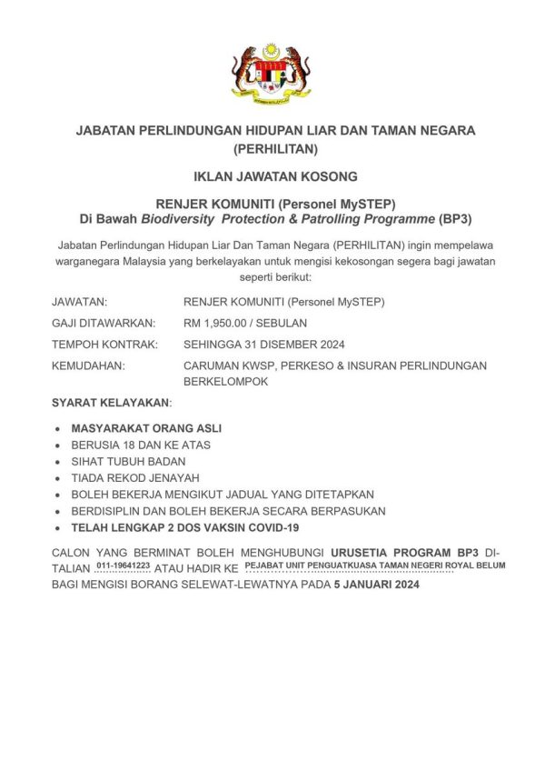 Iklan Jawatan Kosong Jabatan Perlindungan Hidupan Liar Dan Taman Negara (Perhilitan)