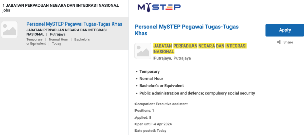 Permohonan jawatan ini boleh dibuat melalui Portal MyFutureJobs. Sila ke Portal MyFutureJobs dan Masukkan Kata Carian yang ingin dicari “Jabatan Perpaduan Negara Dan Integrasi (JPNIN)” di bahagian carian untuk memohon jawatan yang diiklankan.