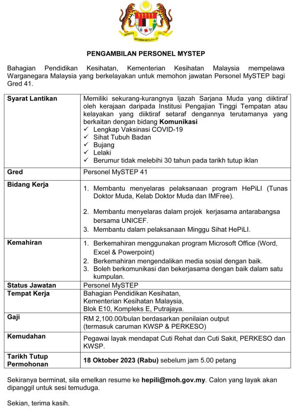 Iklan Jawatan Kosong Kementerian Kesihatan Malaysia (KKM)