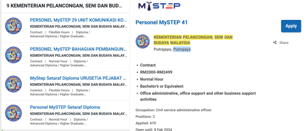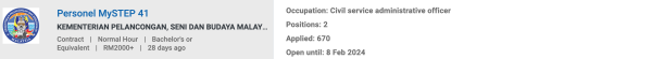Permohonan jawatan ini boleh dibuat melalui Portal MyFutureJobs. Sila ke Portal MyFutureJobs dan Masukkan Kata Carian yang ingin dicari “KEMENTERIAN PELANCONGA, SENI DAN BUDAYA MALAYSIA” di bahagian carian untuk memohon jawatan yang diiklankan.