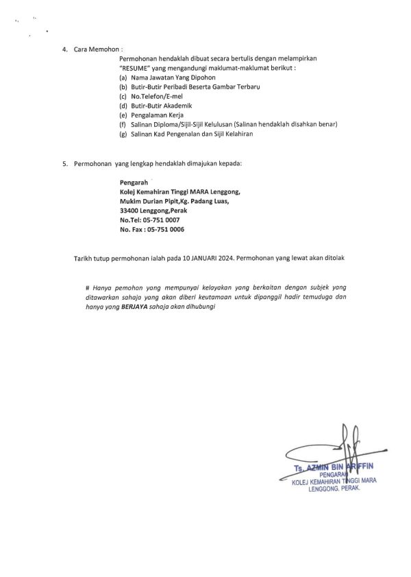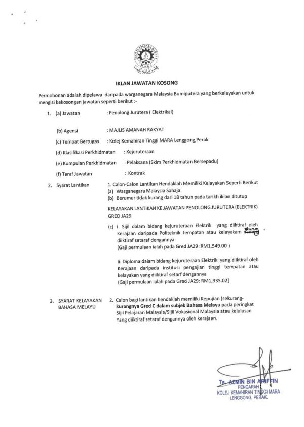 Iklan Jawatan Kosong Kolej Kemahiran Tinggi Mara Lenggong