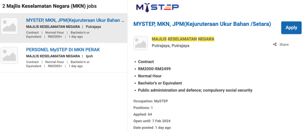 Permohonan jawatan ini boleh dibuat melalui Portal MyFutureJobs. Sila ke Portal MyFutureJobs dan Masukkan Kata Carian yang ingin dicari “MAJLIS KESELAMATAN NEGARA” di bahagian carian untuk memohon jawatan yang diiklankan.
