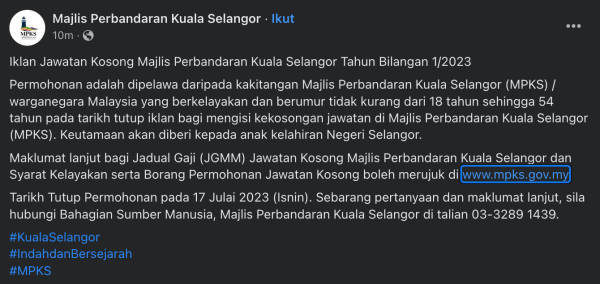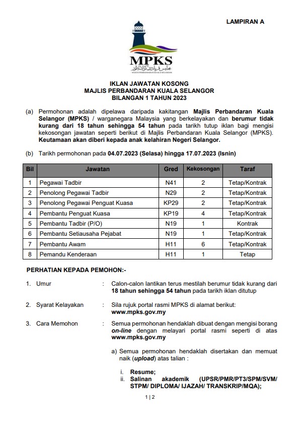 Iklan Jawatan Kosong Majlis Perbandaran Kuala Selangor (MPKS)