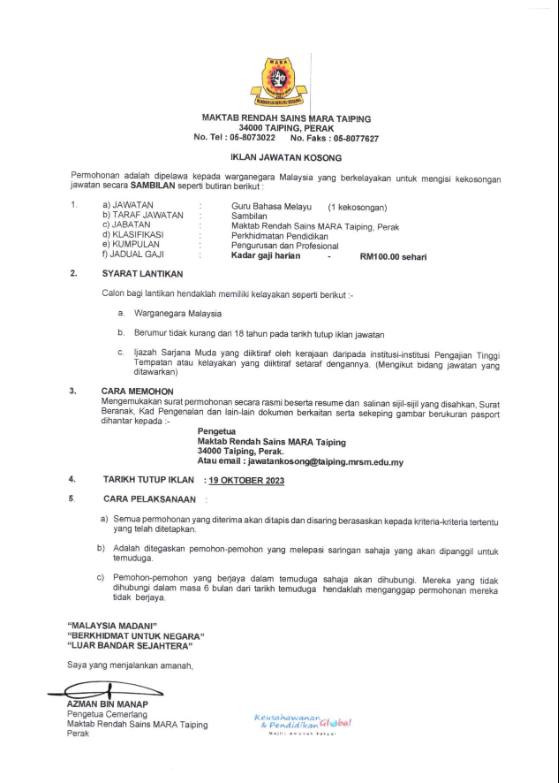 Iklan Jawatan Kosong Maktab Rendah Sains Mara (MRSM) Taiping