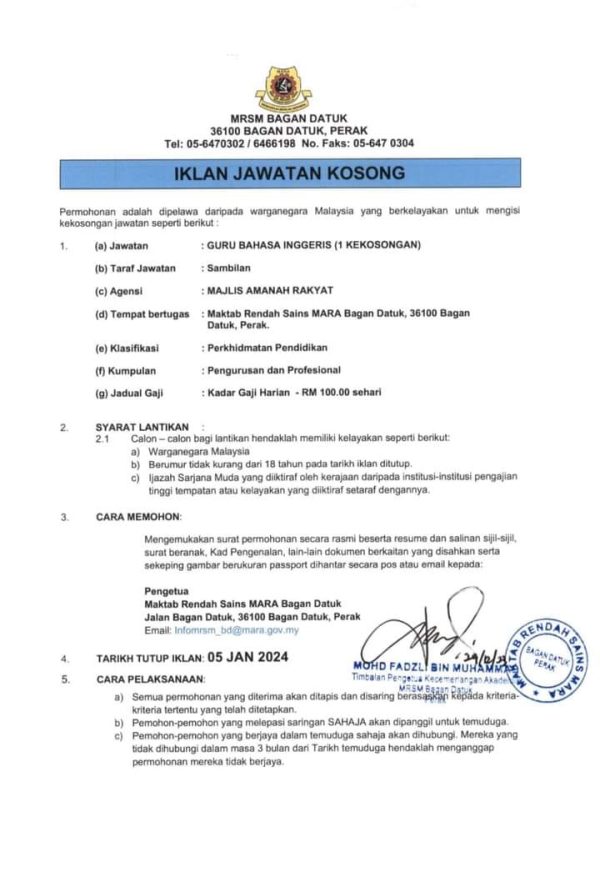 Iklan Jawatan Kosong MRSM Bagan Datuk