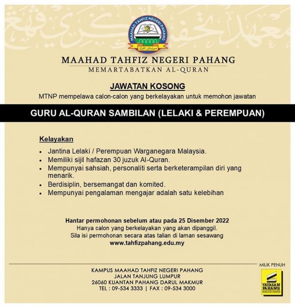 Iklan Jawatan Maahad Tafiz Negeri Pahang (MTNP)