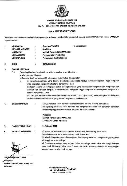 Iklan Jawatan Maktab Rendah Sains MARA (MRSM)