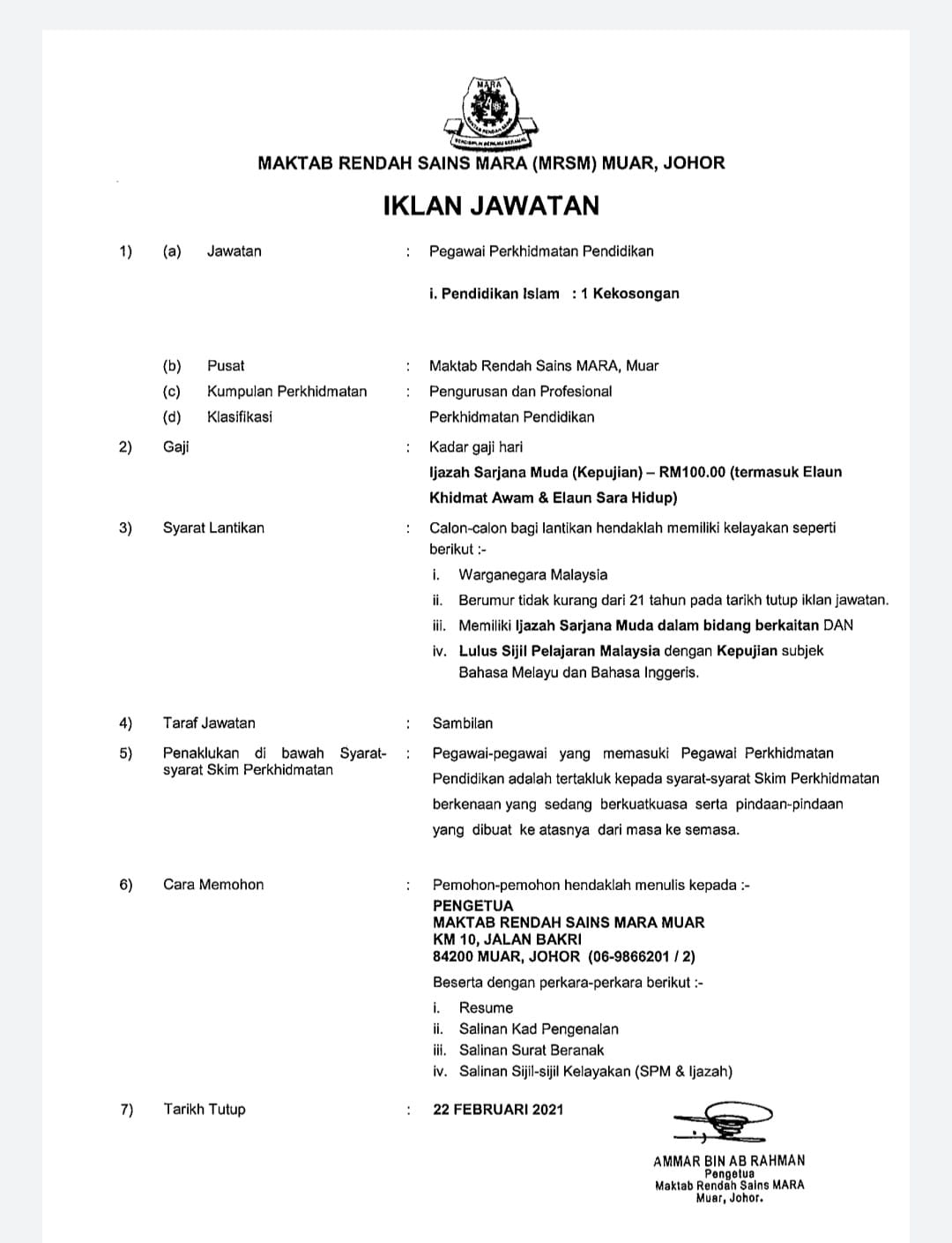Iklan Jawatan Maktab Rendah Sains MARA (MRSM)
