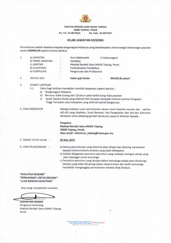 Iklan Jawatan Mrsm Taiping