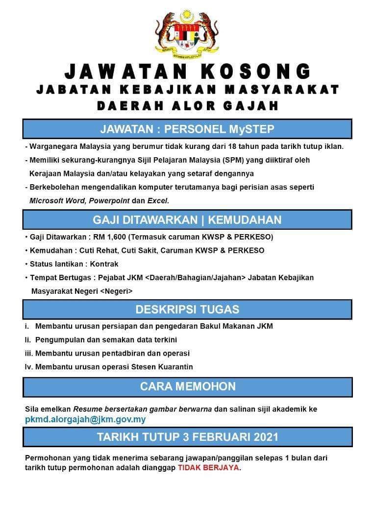 Iklan Jawatan Pejabat Kebajikan Masyarakat Daerah Alor Gajah