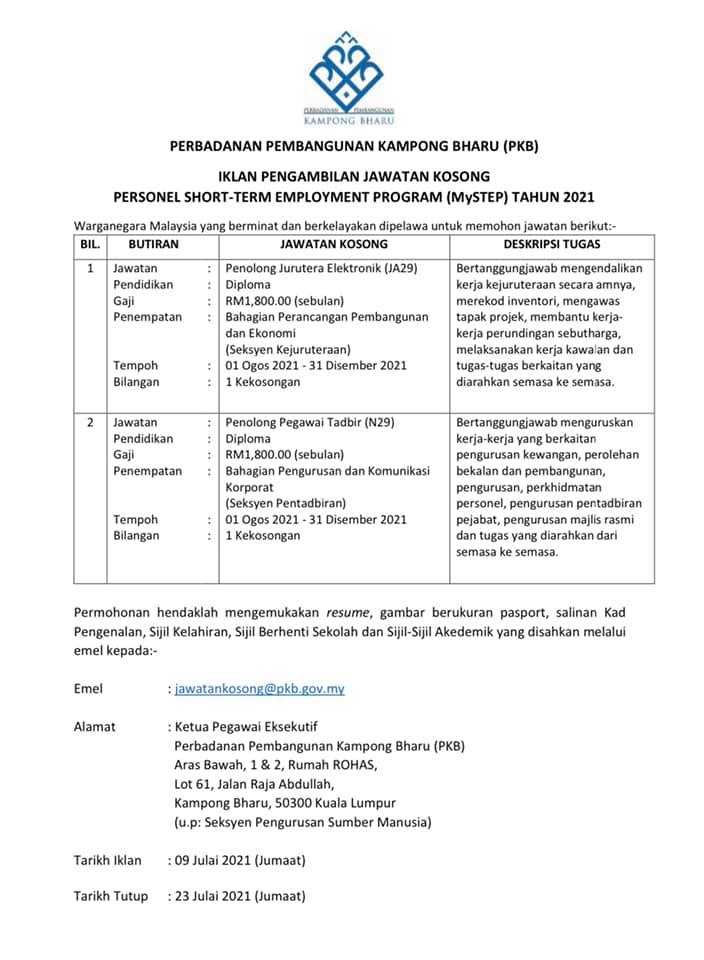 Iklan Jawatan Perbadanan Pembangunan Kampong Bahru (PKB)