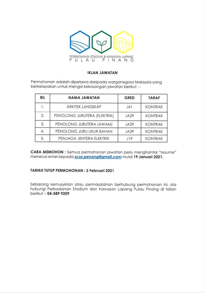 Iklan Jawatan Perbadanan Stadium & Kawasan Lapang Pulau Pinang