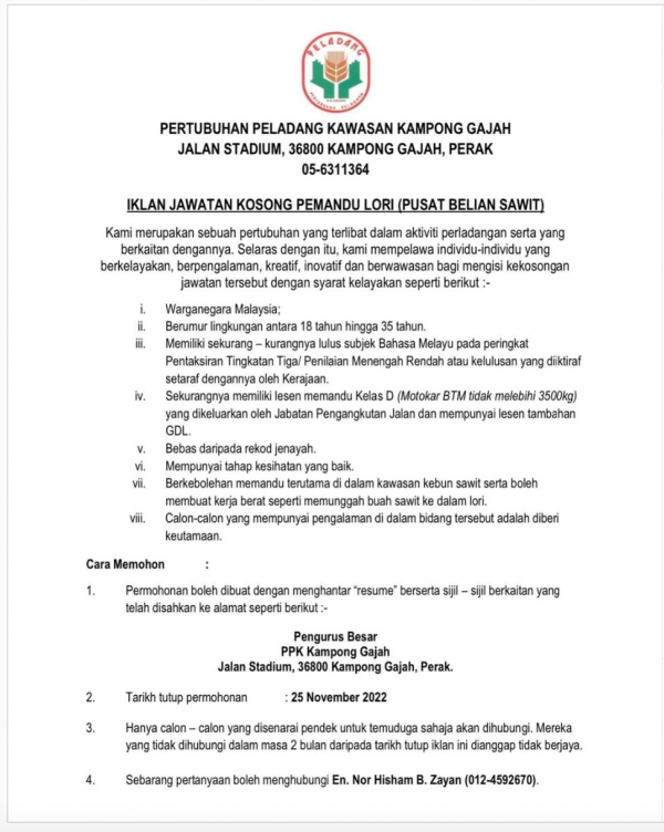 Iklan Jawatan Pertubuhan Peladang Kawasan Kampong Gajah