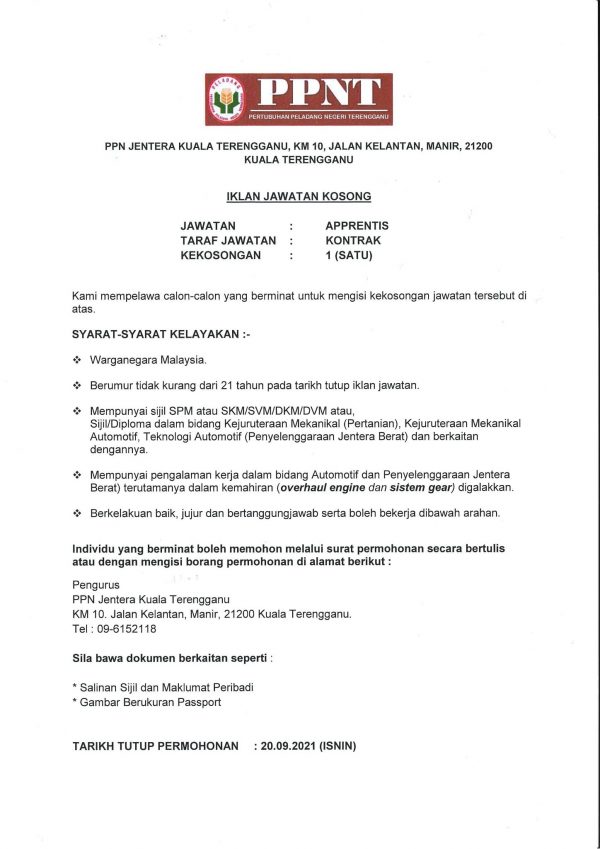 Iklan Jawatan Pertubuhan Peladang Negeri Terengganu