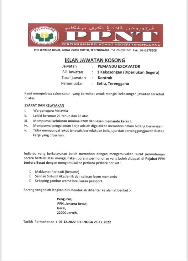 Iklan Jawatan Pertubuhan Peladang Negeri Terengganu