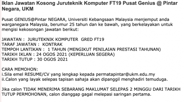 Iklan Jawatan Pusat GENIUS@Pintar Negara UKM