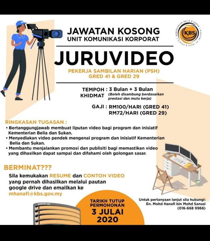Jawatan Kosong Juruvideo Gred 41 & Gred 29 Di Kementerian Belia dan Sukan (KBS)