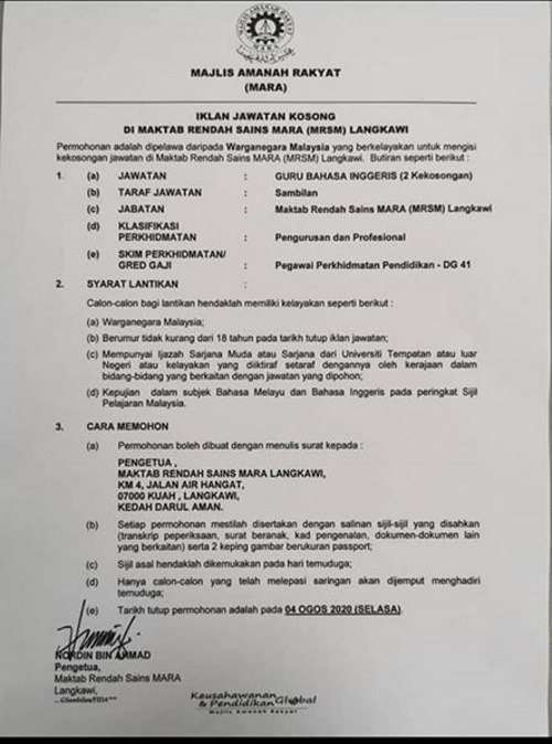Jawatan Kosong Maktab Rendah Sains Mara (MRSM)