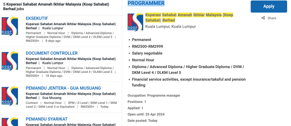 Permohonan jawatan ini boleh dibuat melalui Portal MyFutureJobs. Sila ke Portal MyFutureJobs dan Masukkan Kata Carian yang ingin dicari “Koperasi Sahabat Amanah Ikhtiar Malaysia (Koop Sahabat) Berhad” di bahagian carian untuk memohon jawatan yang diiklankan.