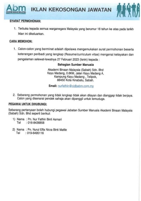 Iklan Jawatan Akademi Binaan Malaysia (ABM)
