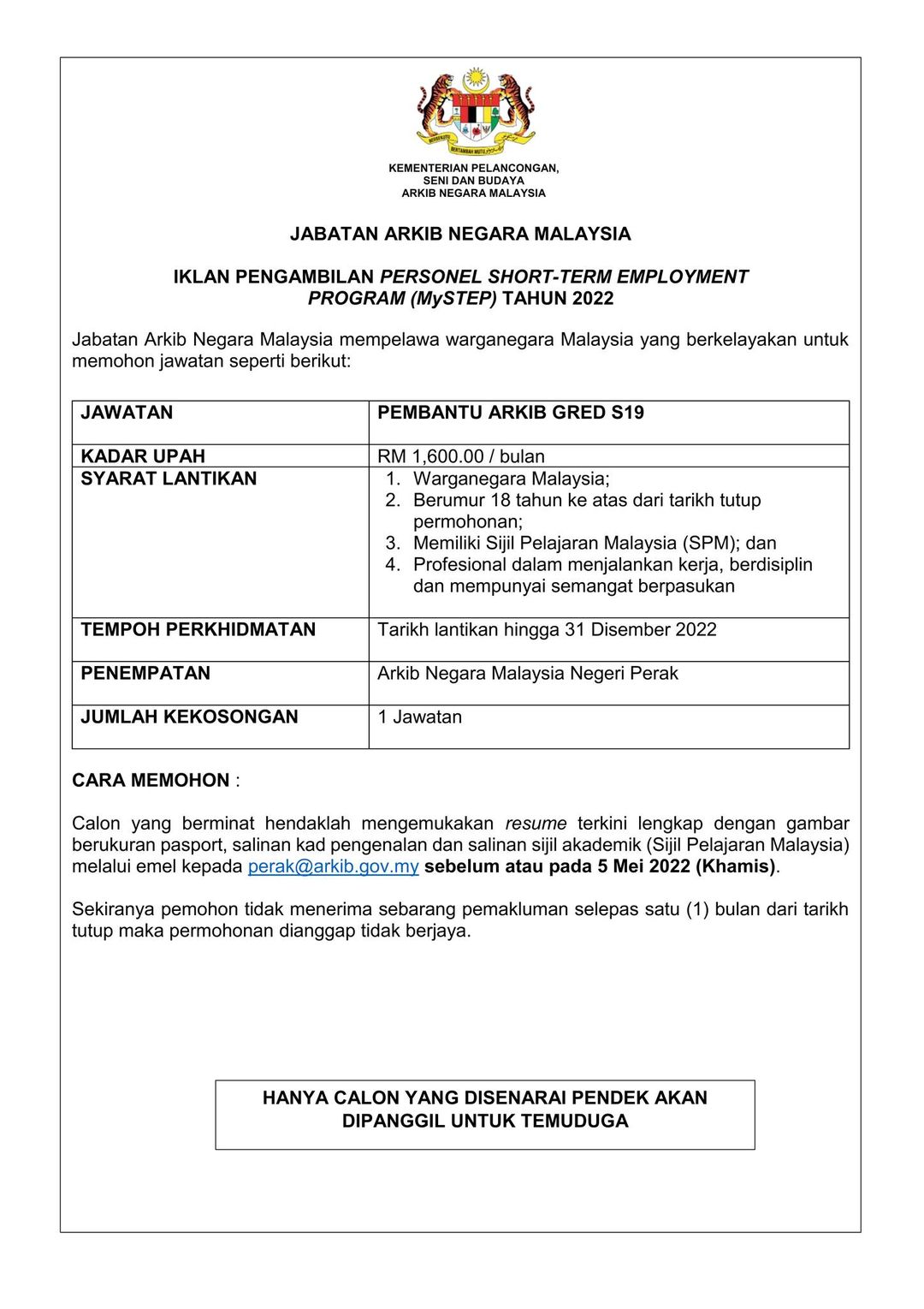 Iklan Jawatan Arkib Negara Malaysia