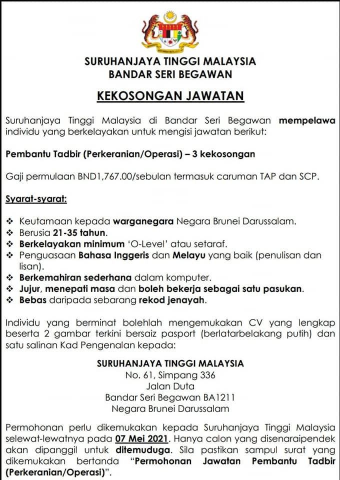 Iklan Jawatan High Commission of Malaysia, Bandar Seri Begawan