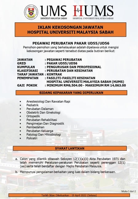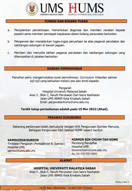 Iklan Jawatan Hospital Universiti Malaysia Sabah (HUMS)