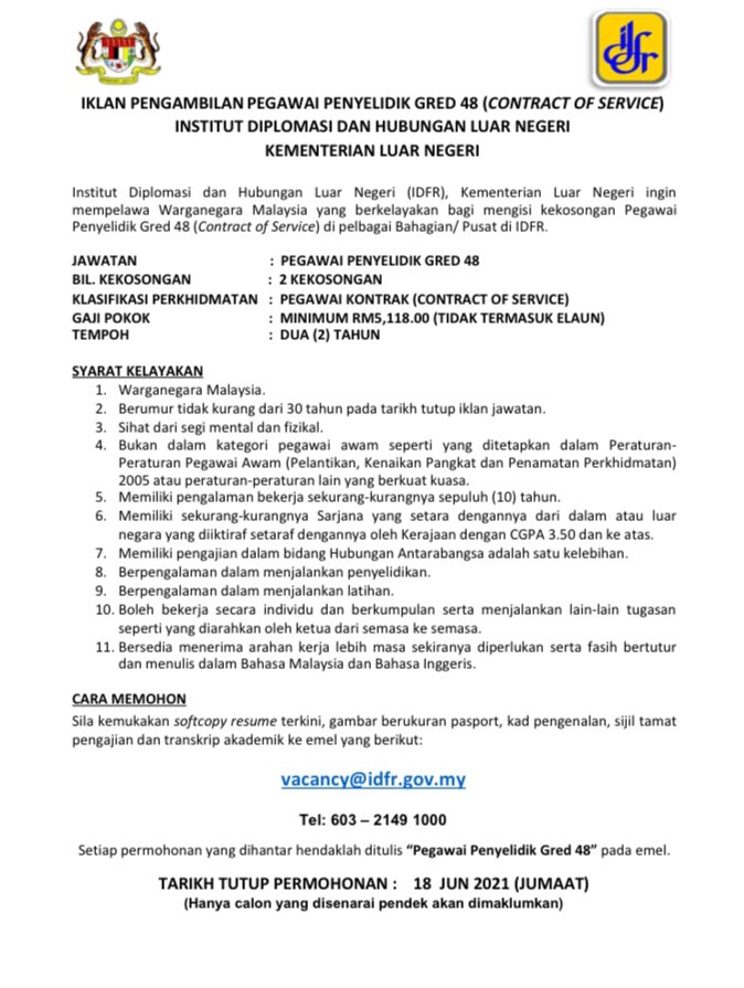 Iklan Jawatan Institut Diplomasi dan Hubungan Luar Negeri (IDFR)