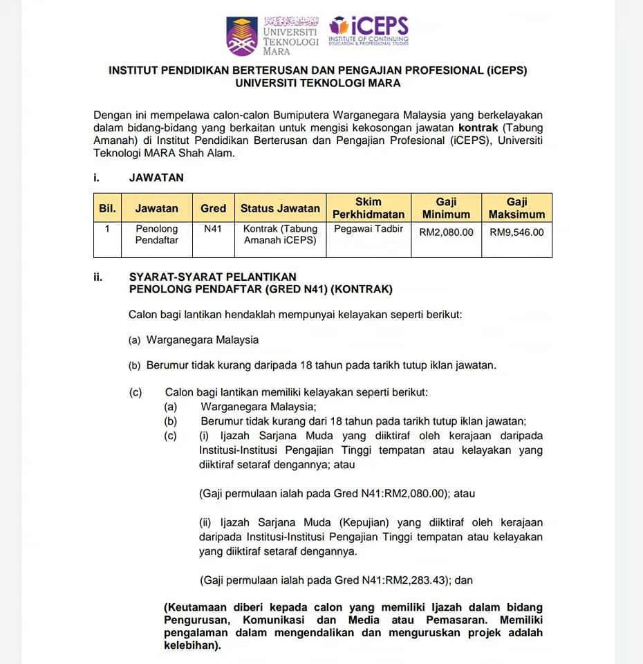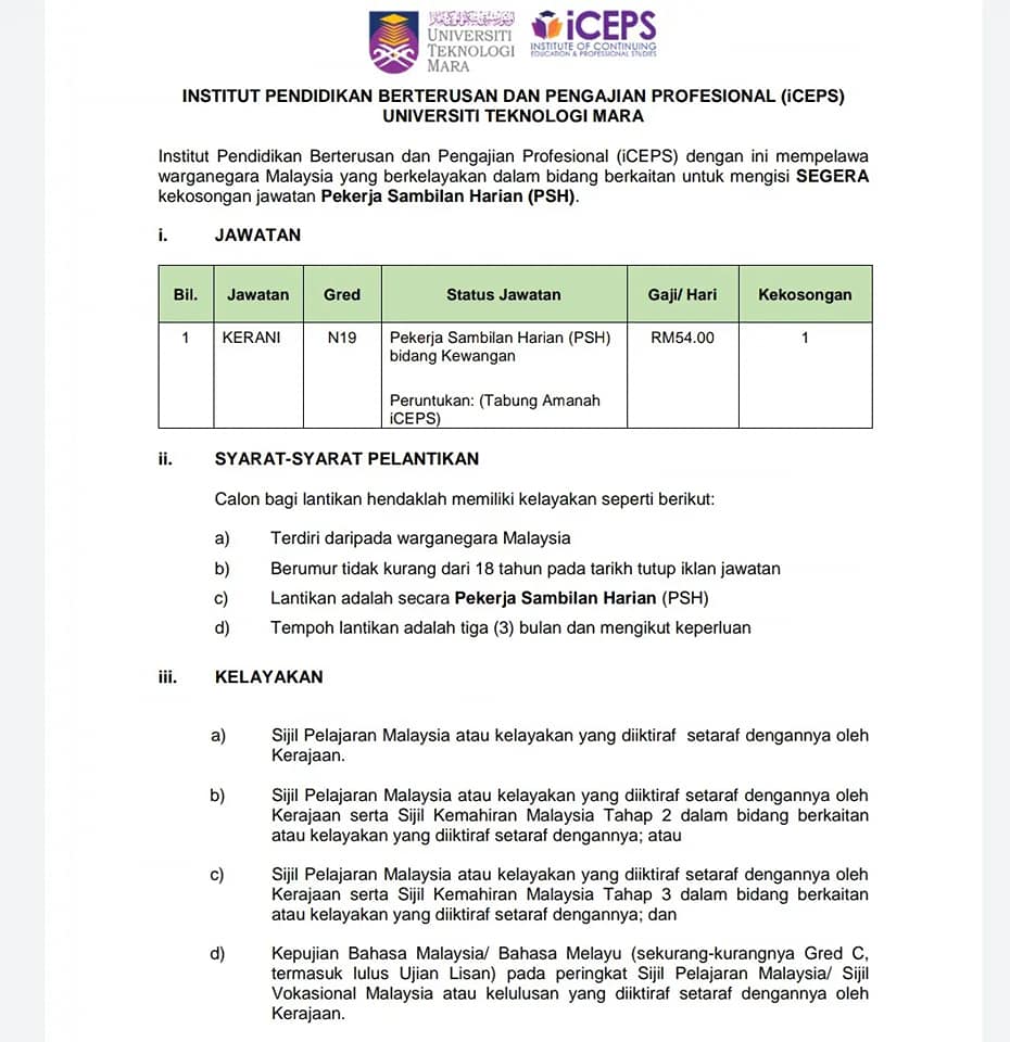 Iklan Jawatan Institut Pendidikan Berterusan dan Pengajian Profesional (iCEPS) UITM Klik Jawatan Disini