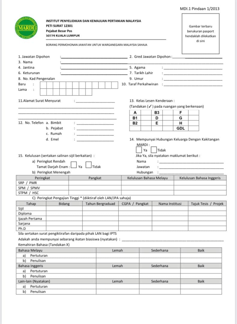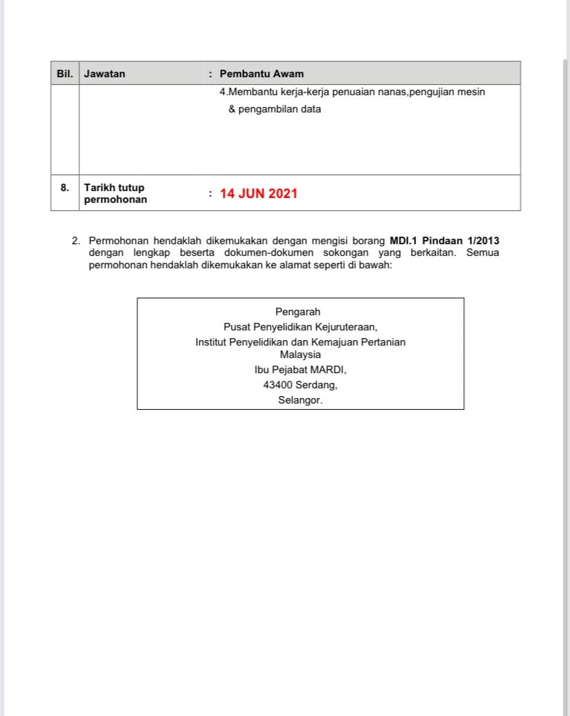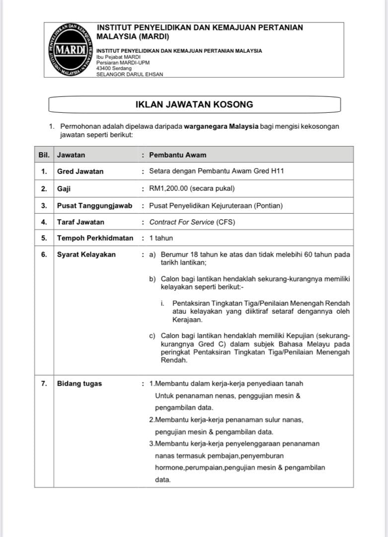 Iklan Jawatan Institut Penyelidikan dan Kemajuan Pertanian Malaysia (MARDI)