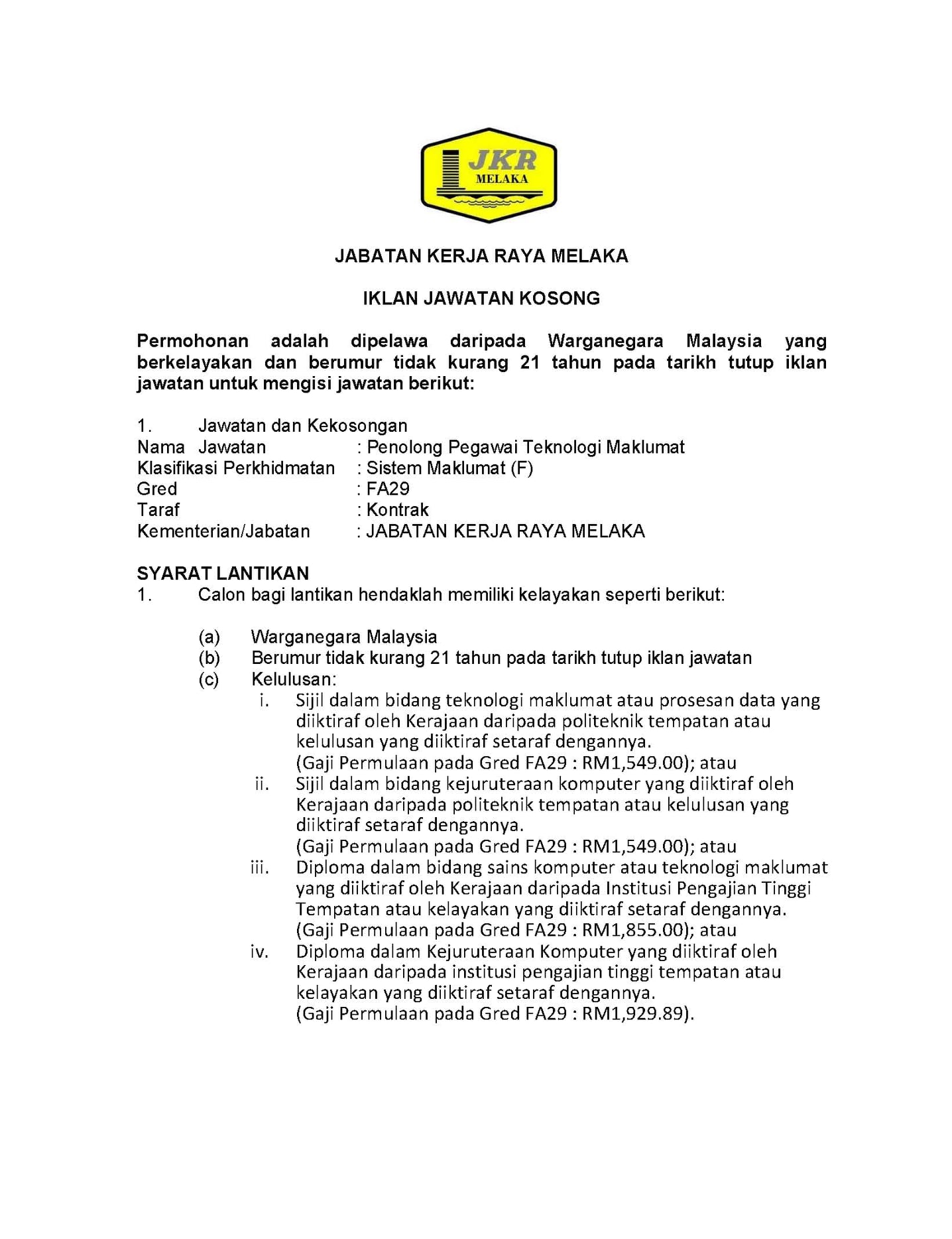 Iklan Jawatan Jabatan Kerja Raya (JKR)