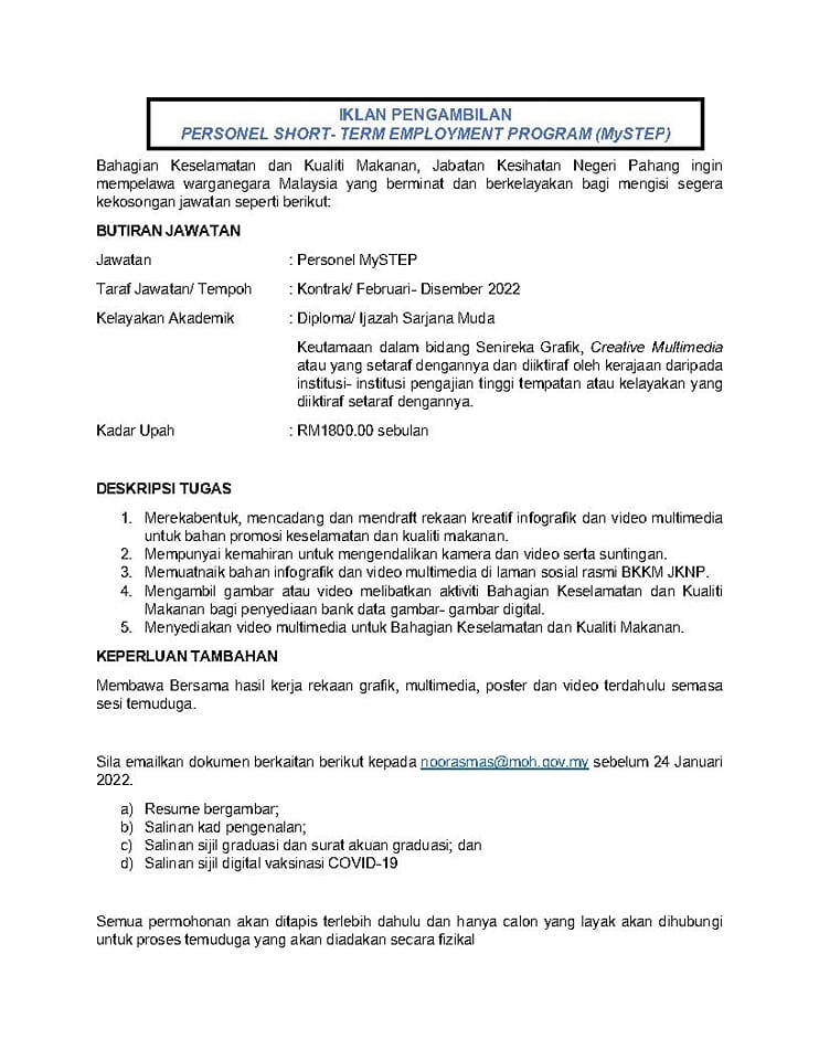 Iklan Jawatan Jabatan Kesihatan Negeri Pahang