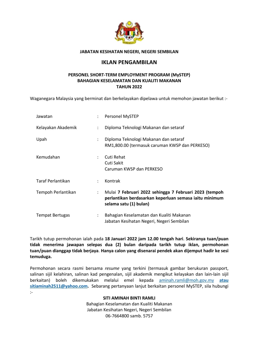 Iklan Jawatan Jabatan Kesihatan Negeri Sembilan