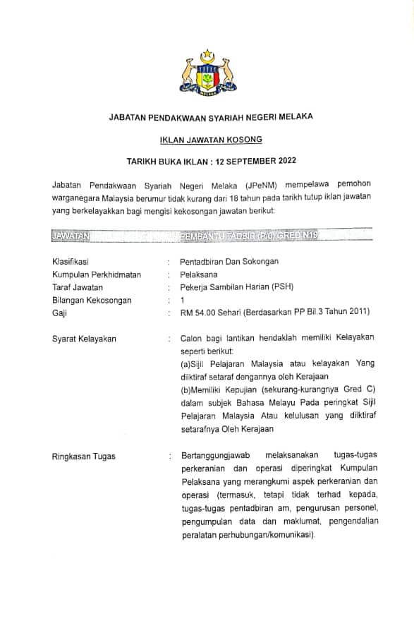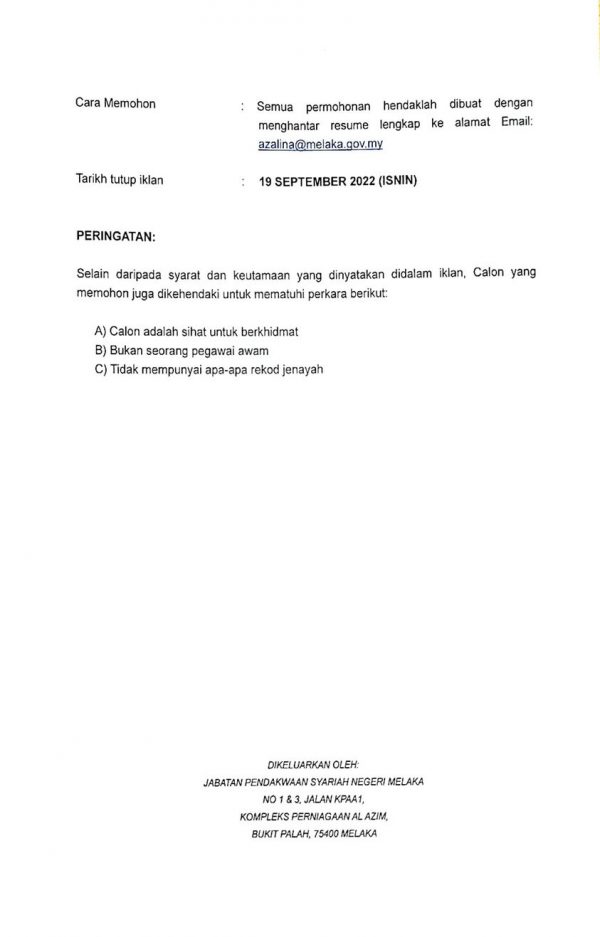 Iklan Jawatan Jabatan Pendakwaan Syariah Negeri Melaka