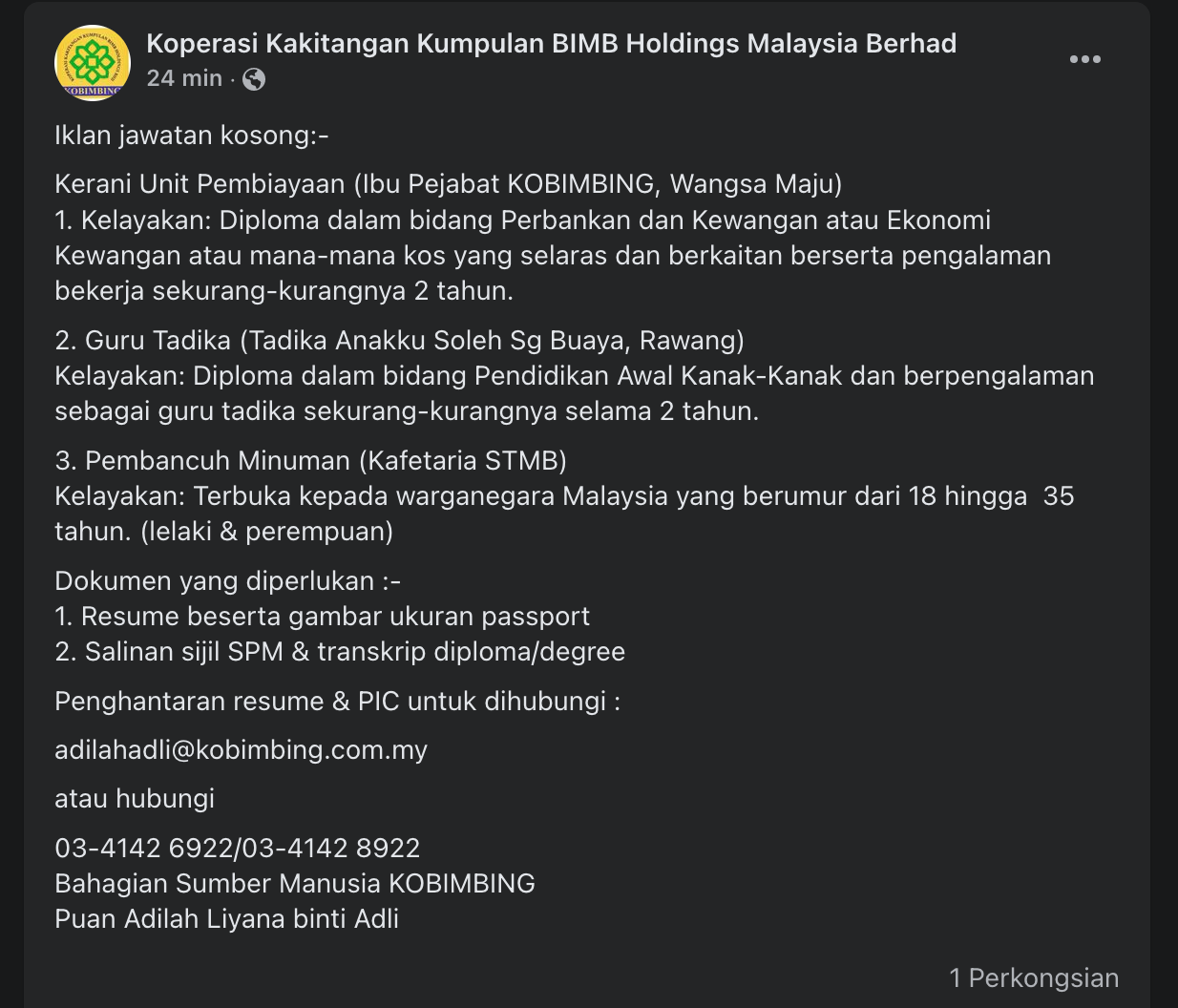 Iklan Jawatan Koperasi Kakitangan Kumpulan BIMB Holdings Malaysia Berhad