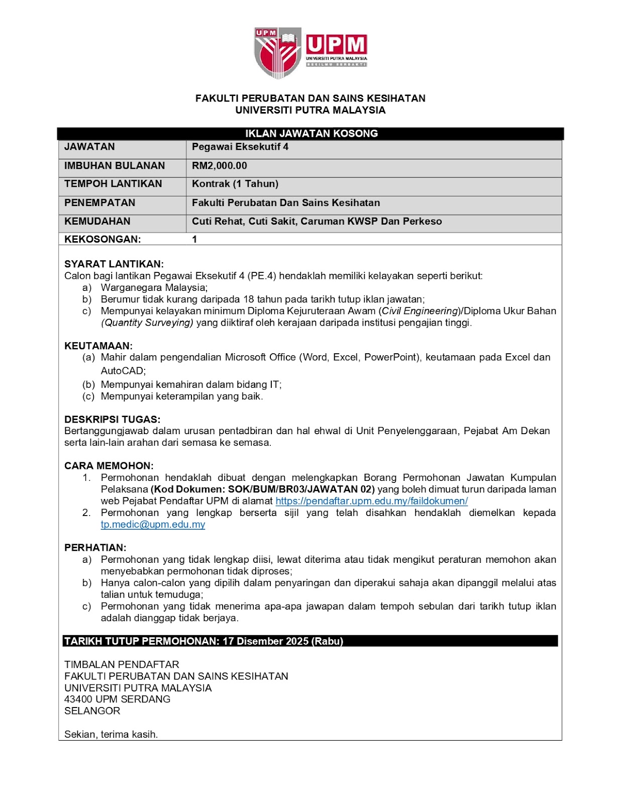 Iklan Jawatan Kosong Fakulti Perubatan Dan Sains Kesihatan, Universiti Putra Malaysia (UPM)