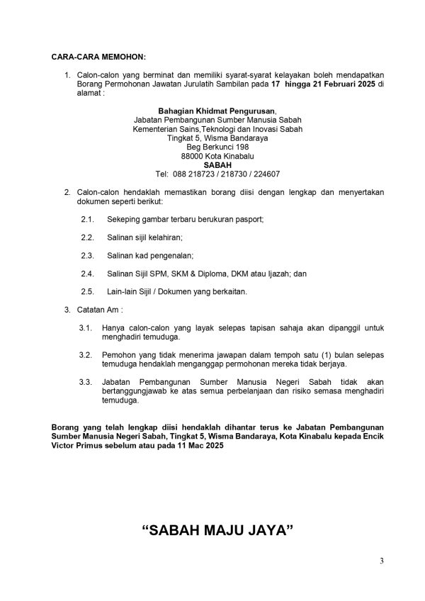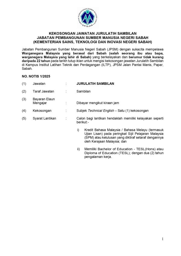 Iklan Jawatan Kosong Jabatan Pembangunan Sumber Manusia Negeri Sabah