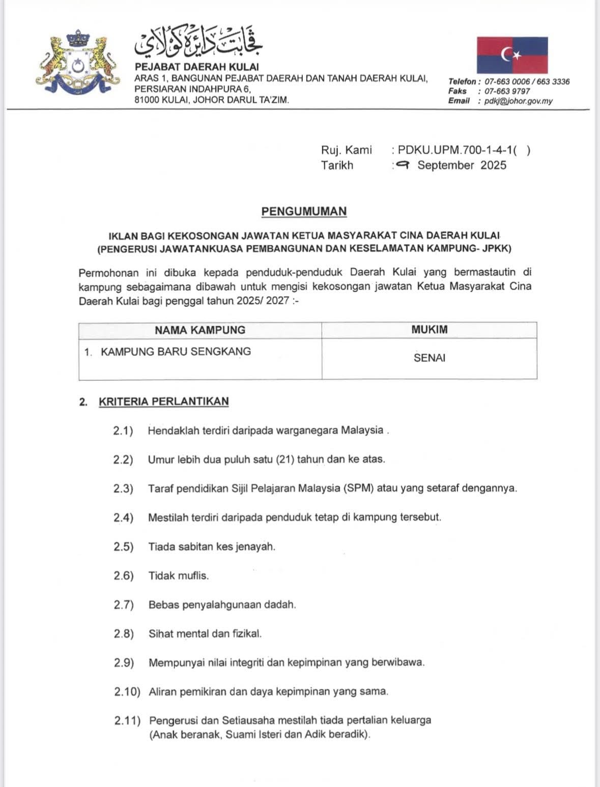 Iklan Jawatan Kosong Pejabat Daerah Kulai